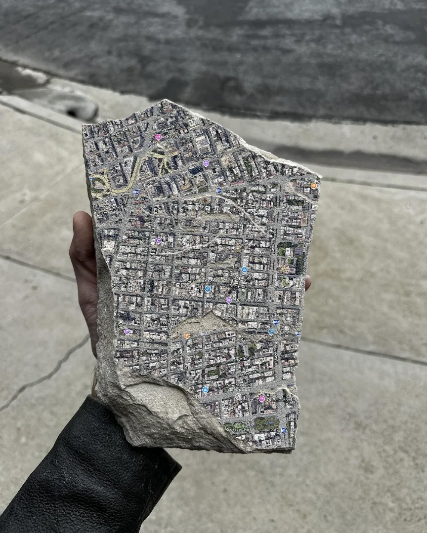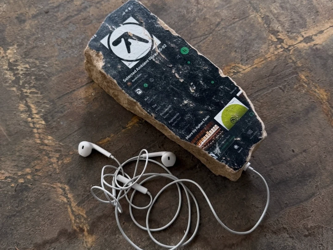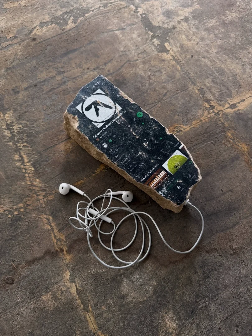 One of the more striking examples in the artist’s catalog features a conceptual “fossil” inspired by electronic music culture. The piece resembles a carved stone tablet containing a stylized imprint of a digital music interface, as though a streaming platform had somehow been preserved in sedimentary rock.